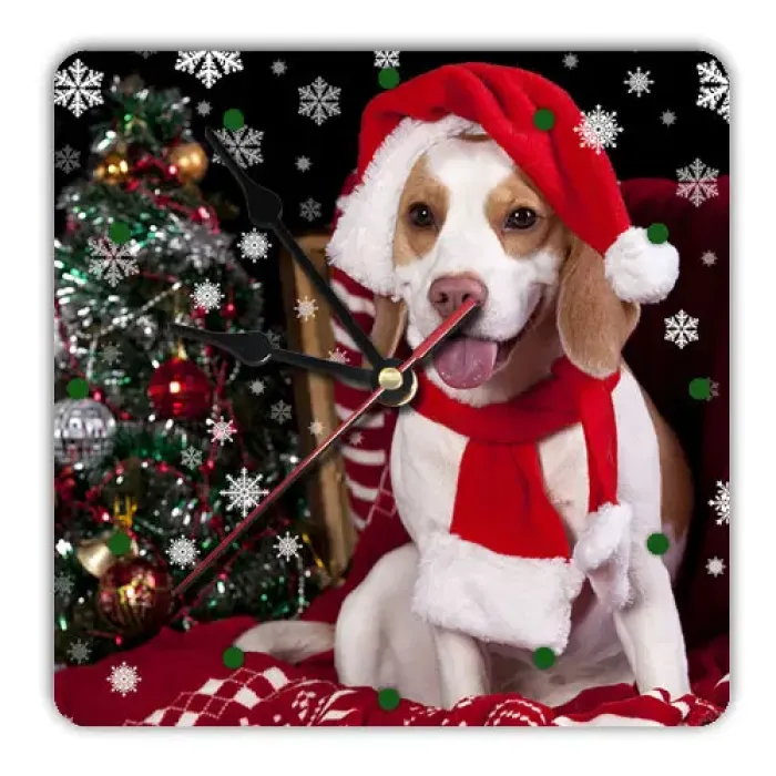 Настенные часы с изображением собаки, выполненные из пластика. Диаметр циферблата составляет 20 см.