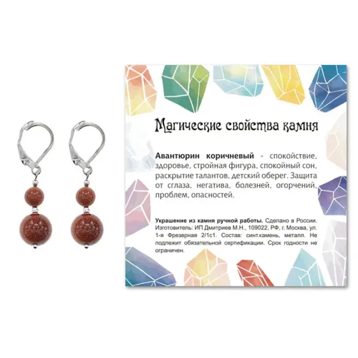 Серьги ручной работы из синтетического камня Коричневый авантюрин — это стильный аксессуар, который добавит изысканности любому образу. Эти серьги имеют длину 38 мм (включая швензу) и представлены в двух размерах бусин: 6 мм и 10 мм. Материал фурнитуры выполнен из бижутерного сплава с покрытием под серебро, что придаёт изделию элегантный вид. Каждая пара упакована в прозрачный пакет с подвесом и дополнена вкладышем, рассказывающим о значении камня, что делает их отличным подарком для близких или друзей. Коричневый авантюрин традиционно ценится за свою красоту и гармонизирующие свойства.