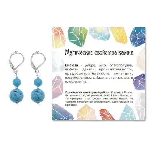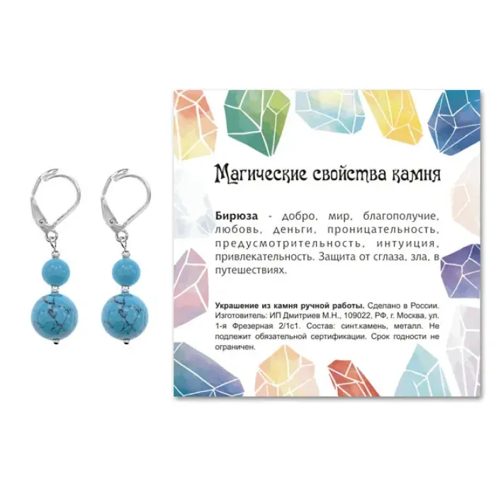 Серьги Бирюза SEB01-06 — это изысканные украшения ручной работы, выполненные из синтетического камня бирюзы. Эти серьги не только привлекают внимание своим ярким цветом, но и символизируют гармонию и защиту. Длина изделий с учётом швензы составляет 38 мм, а диаметр бусин — 6 мм и 10 мм. Фурнитура изготовлена из бижутерного сплава с покрытием под серебро, что придаёт серьгам стильный вид и долговечность. Каждая пара упакована в прозрачный пакет с подвесом и дополнена вкладышем, который содержит информацию о значении камня. Серьги идеально подойдут для любого случая, добавляя нотку элегантности в образ.