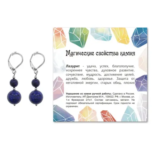 Серьги ручной работы из натурального камня Лазурит — это не просто украшение, а символ гармонии и спокойствия. Эти уникальные серьги длиной 38 мм (включая швензу) станут прекрасным дополнением к любому образу. Бусины диаметром 6 мм и 10 мм придают изделию элегантность и стиль. Фурнитура выполнена из бижутерного сплава с покрытием под серебро, что обеспечивает долговечность и привлекательный внешний вид. Каждая пара упакована в прозрачный пакет с подвесом и комплектуется вкладышем, рассказывающим о значении камня Лазурит в культуре. Это идеальный подарок для ценителей красоты и оригинальности.