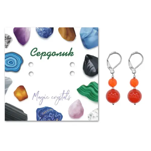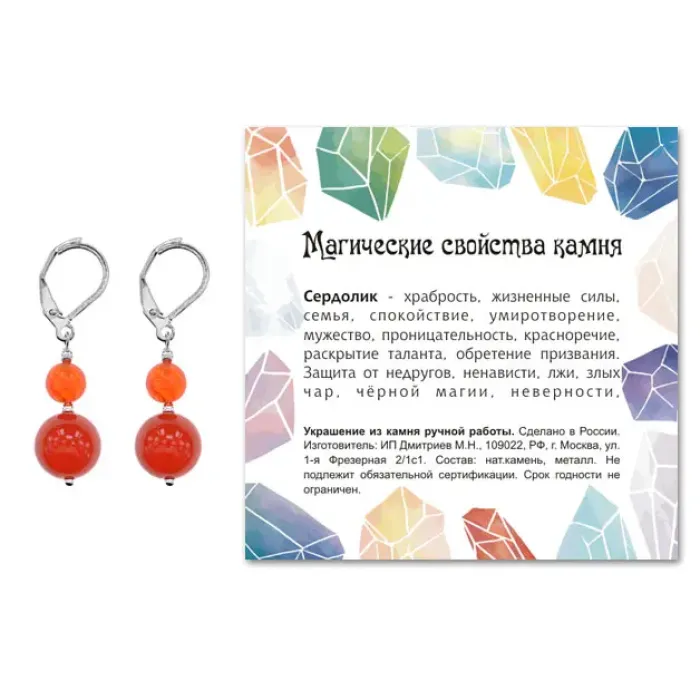 - Каждая пара упакована в прозрачный пакет с подвесом, дополнительно укомплектована вкладышем с описанием значения камня Сердолик, который традиционно ценится за свои энергетические свойства.