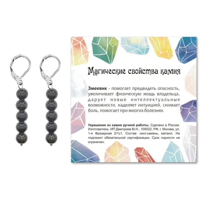 Серьги Змеевик SEB02-09 — это уникальное украшение ручной работы, выполненное из синтетического камня змеевика. Эти серьги не только привлекают внимание своим стильным дизайном, но и несут в себе символику силы и защиты. Основные характеристики: длина изделий (включая швензу) составляет 48 мм, а диаметр бусин — 6 мм. Фурнитура изготовлена из бижутерного сплава с покрытием под серебро, что придаёт им дополнительный шарм. Каждая пара упакована в прозрачный пакет с подвесом и укомплектована вкладышем, содержащим описание значения камня. Серьги идеально подойдут как для повседневного ношения, так и для особых случаев.