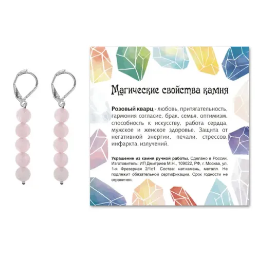 Серьги ручной работы из натурального камня Розовый кварц — это не только стильное украшение, но и символ любви и гармонии. Эти серьги длиной 48 мм (включая швензу) с бусинами диаметром 6 мм идеально подойдут для любого случая. Изготовленные из бижутерного сплава с покрытием под серебро, они обладают прочностью и элегантным видом. Упакованы в прозрачный пакет с подвесом и дополнены вкладышем, который расскажет о значении камня. Серьги традиционно ценятся за свои эстетические качества и энергетическую силу.