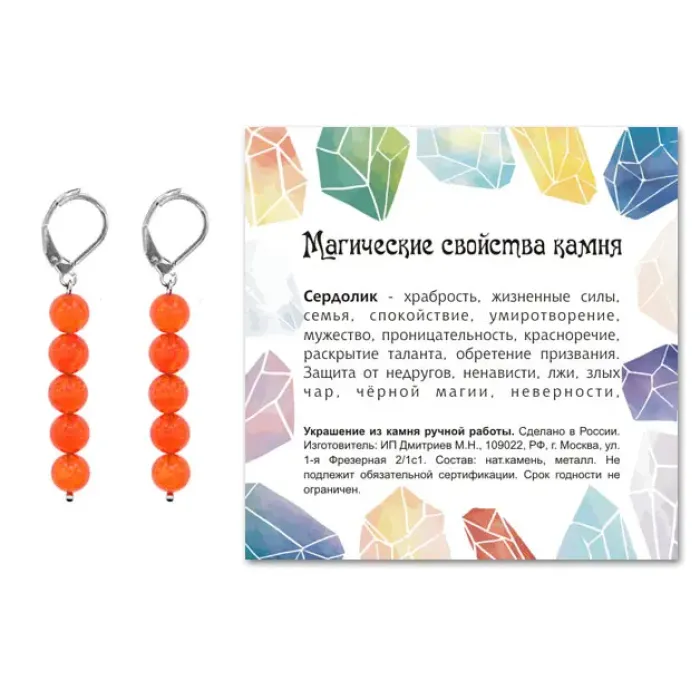 Серьги ручной работы из натурального камня Сердолик обладают уникальной красотой и символическим значением. Эти серьги, длиной 48 мм (включая швензу) и с бусинами диаметром 6 мм, прекрасно дополнят любой образ. Изготовлены из бижутерного сплава с покрытием под серебро, они не только стильные, но и прочные. Упаковка включает прозрачный пакет с подвесом и вкладыш с описанием значения камня, что делает их отличным подарком для ценителей красоты и гармонии. Серьги Сердолик традиционно ассоциируются с теплом и позитивом.