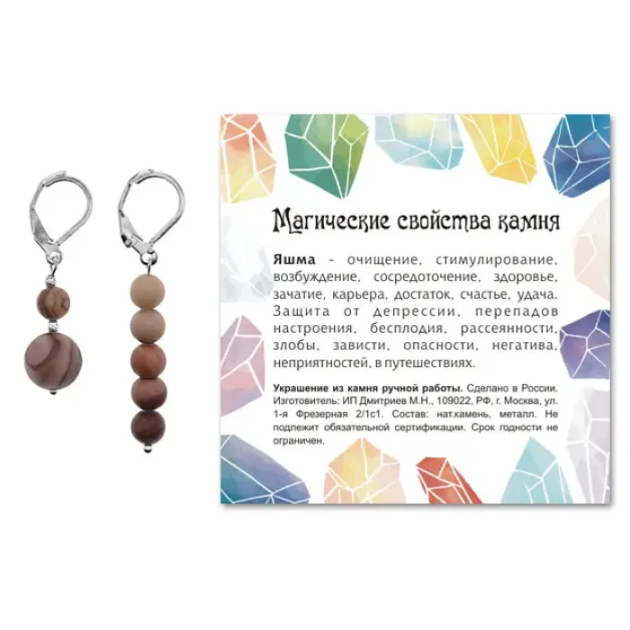 Асимметричные серьги из натурального камня Яшма коричневая — это уникальное украшение, которое привносит в образ нотки природной красоты и элегантности. Эти серьги ручной работы имеют длину 38 мм и 48 мм (включая швензы) и отличаются диаметром бусин 6 мм и 10 мм. Фурнитура выполнена из бижутерного сплава с покрытием под серебро, что обеспечивает долговечность и стильный вид. Каждая пара упакована в прозрачный пакет с подвесом и дополнена вкладышем, рассказывающим о значении яшмы в культуре. Серьги идеально подходят для создания как повседневных, так и вечерних образов.