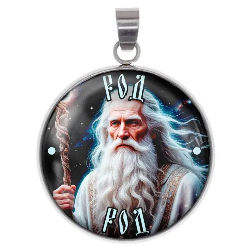 Амулет из нержавеющей стали с изображением славянского божества Род под выпуклой стеклянной линзой.