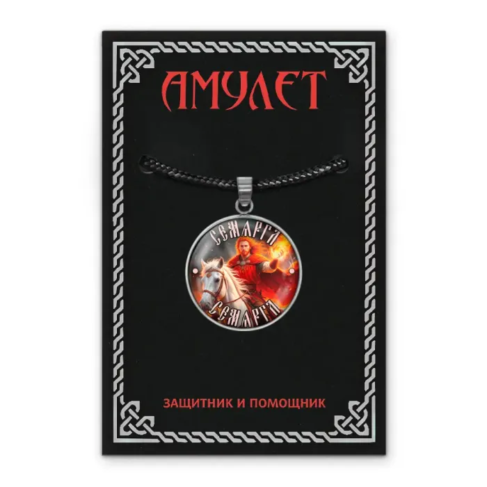 Амулет из нержавеющей стали с изображением славянского бога Семаргла под выпуклой стеклянной линзой.