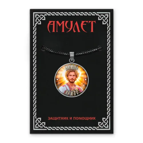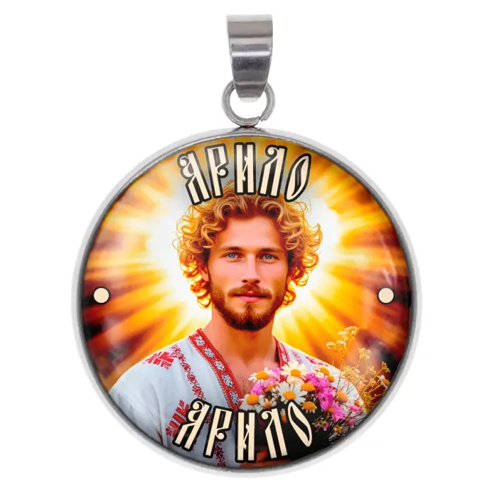 Амулет из нержавеющей стали с изображением славянского божества Ярило под выпуклой стеклянной линзой.