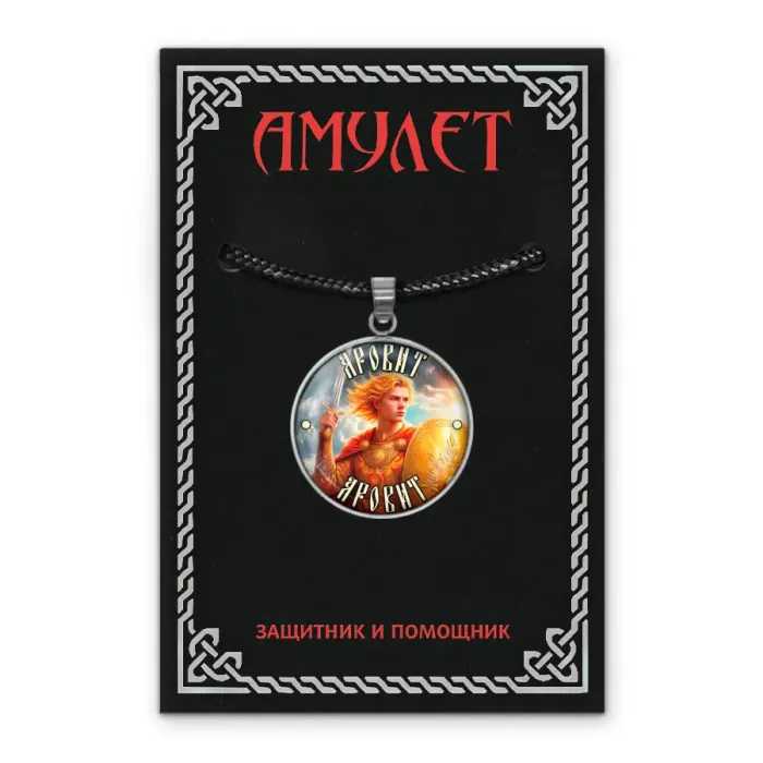 Амулет из нержавеющей стали с изображением славянского бога Яровита под выпуклой стеклянной линзой.