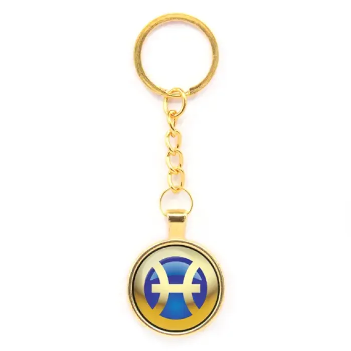 Брелок Знаки Зодиака - Рыбы представляет собой изысканное украшение, которое сочетает в себе символику астрологии и стильный дизайн. Этот односторонний брелок изготовлен из бижутерного сплава с покрытием под золото, что придаёт ему элегантный вид. Выпуклая стеклянная линза добавляет выразительности и глубины изображению знака Рыб.