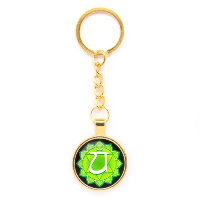 Брелок в форме Анахата чакры из бижутерного сплава с золотым покрытием и выпуклой стеклянной линзой.