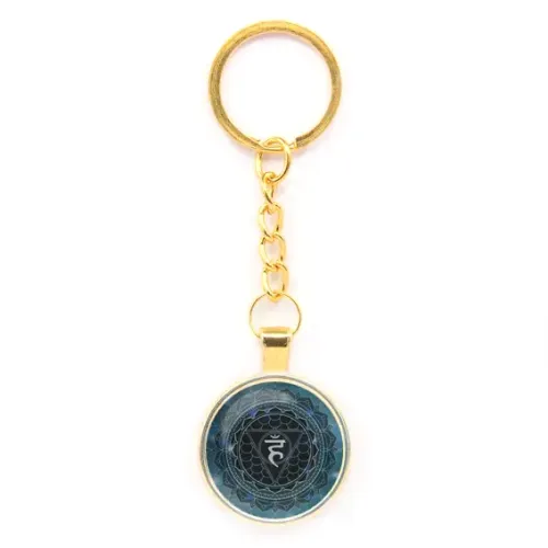 Брелок Вишуддха чакра — это стильный аксессуар, символизирующий гармонию и чистоту общения. Он выполнен из бижутерного сплава с покрытием под золото и оснащён выпуклой стеклянной линзой, что придаёт ему особую привлекательность. Основные особенности: