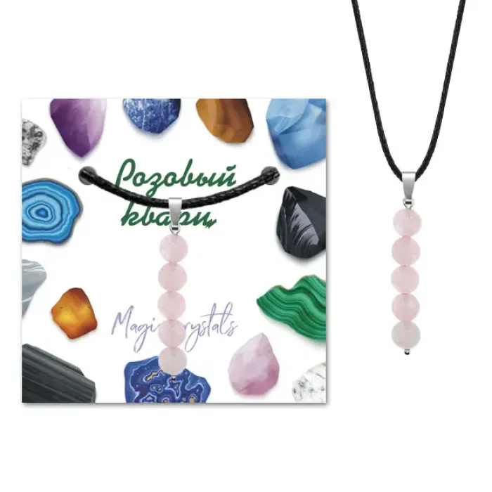 Кулон ручной работы из натурального камня Розовый кварц — символ любви и гармонии. Этот элегантный аксессуар не только дополняет образ, но и традиционно используется для создания атмосферы тепла и уюта. Основные характеристики: длина кулона (включая бейл) составляет 40 мм, а диаметр бусин — 6 мм. Фурнитура выполнена из бижутерного сплава с покрытием под серебро, что придаёт изделию особый шарм. Упаковка включает прозрачный пакет с подвесом, шнурок и вкладыш с описанием значения камня, что делает этот кулон идеальным подарком или сувениром.