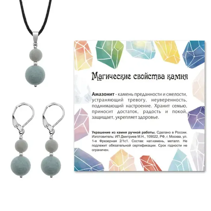 Комплект серьги и кулон из натурального камня Амазонит, выполненный вручную. Этот уникальный набор не только украшает, но и символизирует гармонию и баланс. Длина серёг (включая швензу) составляет 38 мм, а длина кулона (включая бейл) — 30 мм. Бусины диаметром 6 мм и 10 мм придают изделию особую элегантность. Фурнитура изготовлена из бижутерного сплава с покрытием под серебро, что обеспечивает долговечность и стильный вид. Комплект упакован в прозрачный пакет с подвесом и включает вкладыш с описанием значения камня, что делает его отличным подарком для близких.