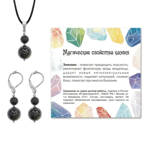 Комплект серьги и кулон из синтетического камня Змеевик — это стильное украшение, которое привносит в образ нотки элегантности. Серьги длиной 38 мм (включая швензу) и кулон длиной 30 мм (включая бейл) идеально дополняют друг друга. Бусины диаметром 6 мм и 10 мм придают комплекту уникальный шарм, а фурнитура из бижутерного сплава с покрытием под серебро обеспечивает долговечность изделия. Упаковка в прозрачный пакет с подвесом делает его отличным подарком, а вкладыш с описанием значения камня добавляет ценности этому оригинальному аксессуару.