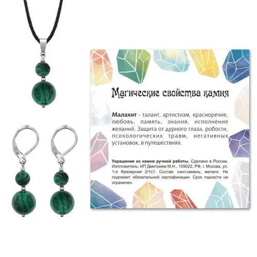 Комплект серьги и кулон, выполненный вручную из синтетического камня Малахит, станет стильным дополнением любого образа. Этот уникальный набор не только привлекает внимание своим дизайном, но и символизирует гармонию и защиту. Основные особенности включают: