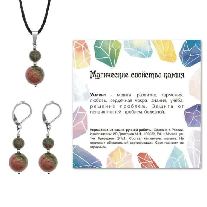 Комплект серьги и кулон, выполненные вручную из натурального камня Унакит, символизируют гармонию и баланс. Эти украшения идеально подойдут как для повседневной носки, так и для особых случаев.