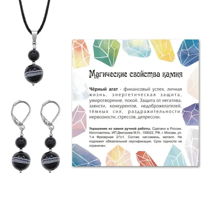 Чёрный агат традиционно ценится за свои защитные свойства, что придаёт этому комплекту особую значимость.