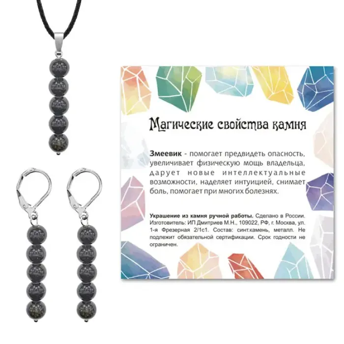 Комплект серьги и кулон из синтетического камня Змеевик — это уникальное украшение, созданное вручную. Серьги длиной 48 мм (включая швензу) и кулон длиной 40 мм (включая бейл) привлекут внимание своим элегантным дизайном. Бусины диаметром 6 мм и 10 мм добавляют изысканности, а фурнитура из бижутерного сплава с покрытием под серебро обеспечивает долговечность изделия. Упакован в прозрачный пакет с подвесом и включает вкладыш с описанием значения камня, что делает этот комплект не только стильным аксессуаром, но и символом гармонии.