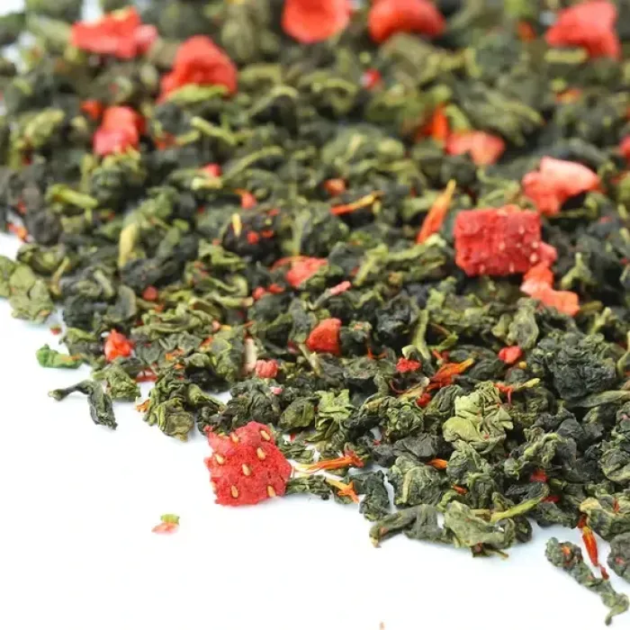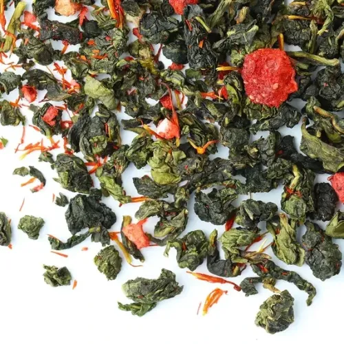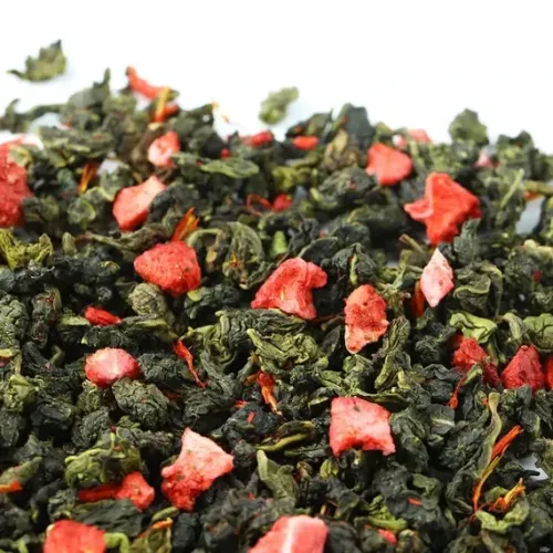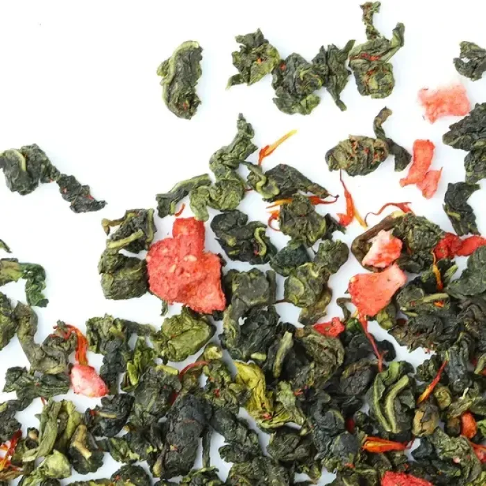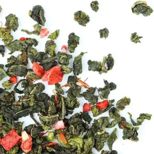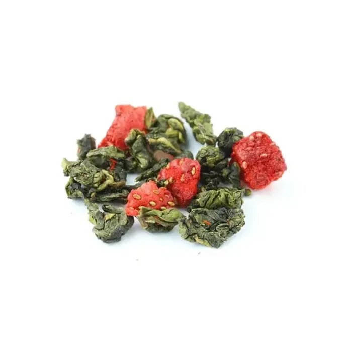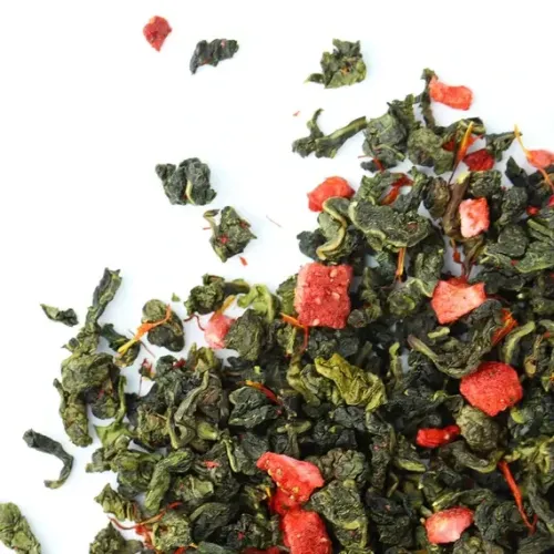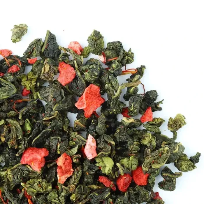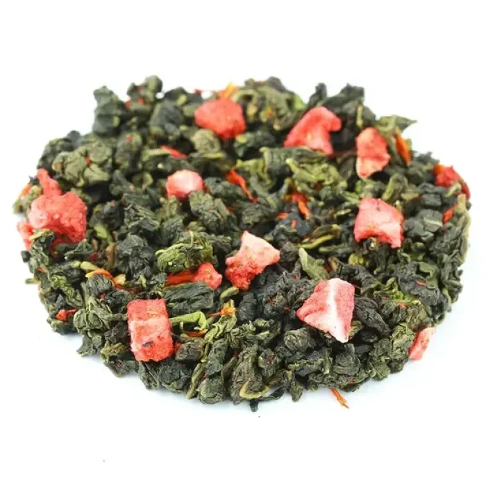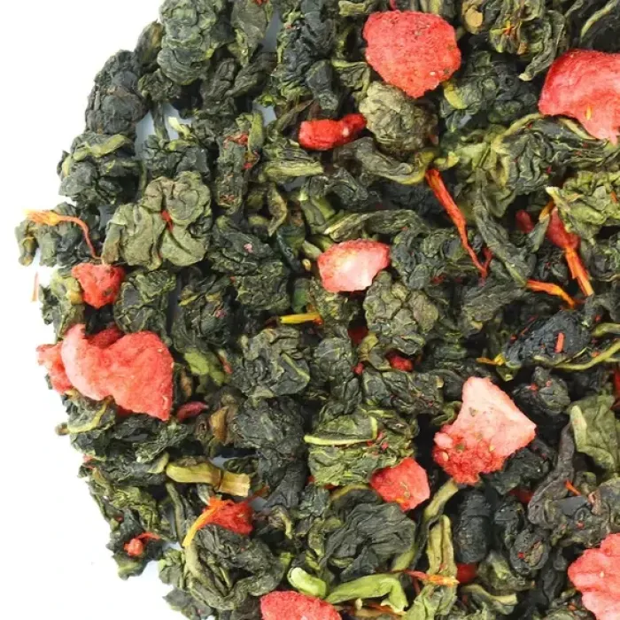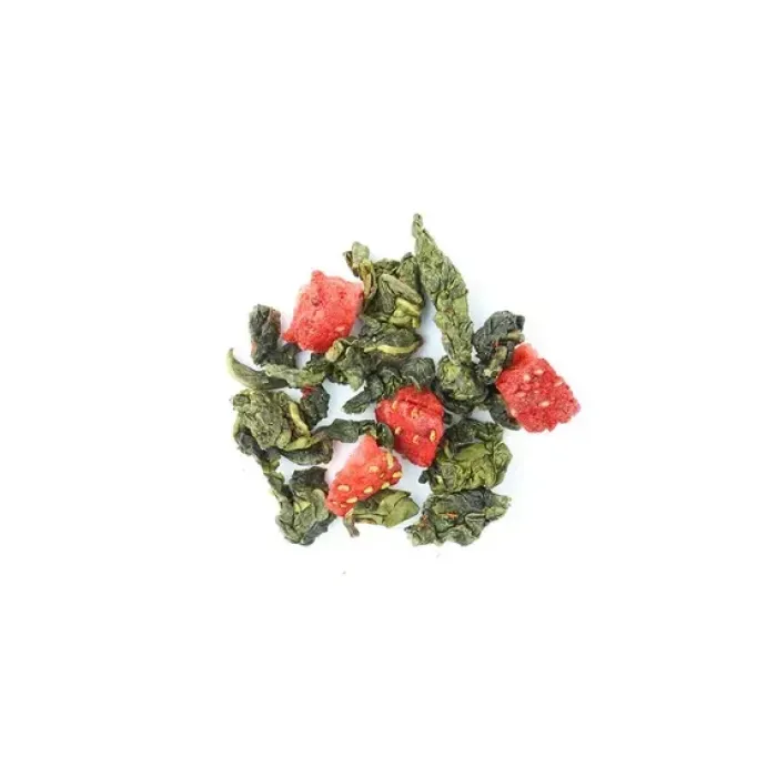 Ароматизированный улун с яркой игрой контрастов: зелёные чайные узелки соседствуют с красными кусочками клубники. Мягкий, деликатный вкус полуферментированного чая гармонично дополняется ягодной сладостью и сливочными нотами, создавая лёгкий и уютный напиток с золотистым настоем.