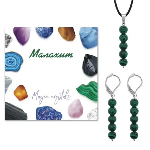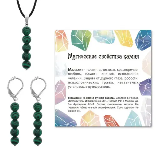 Комплект серьги и кулон, выполненный вручную из синтетического камня Малахит, станет замечательным дополнением к любому образу. Этот аксессуар не только привлекает внимание своей красотой, но и обладает символическим значением: малахит традиционно ценится за свою способность приносить гармонию и защиту.