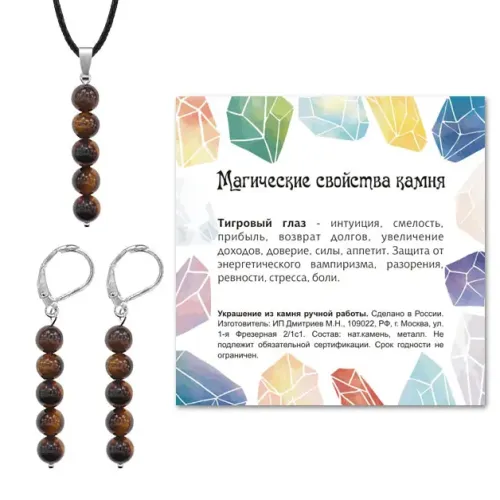 Комплект серьги и кулон из натурального камня Тигровый глаз — это не только стильное украшение, но и символ силы и защиты. Изготовленный вручную, комплект включает в себя серьги длиной 48 мм (включая швензу) и кулон длиной 40 мм (включая бейл). Бусины диаметром 6 мм и 10 мм добавляют изысканности, а фурнитура из бижутерного сплава с покрытием под серебро придаёт элегантный вид. Упаковка в прозрачный пакет с подвесом делает его идеальным подарком, а вкладыш с описанием значения камня углубляет понимание его уникальных свойств.