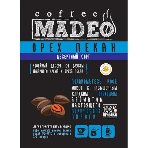 Десертный кофе Madeo создан на основе крупных зёрен марагоджип из Никарагуа. Средняя обжарка раскрывает нежные оттенки заварного крема и ореха пекан, создавая сбалансированный и насыщенный напиток с лёгкой сладостью.
