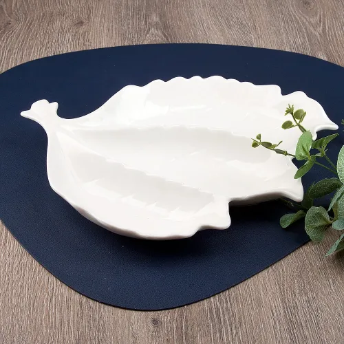 Блюдо изготовлено из фарфора — материала, отличающегося прочностью и гигиеничностью. Поверхность имеет белое покрытие, которое сохраняет блеск и не тускнеет со временем. Фигурная форма является элементом дизайна данной коллекции.