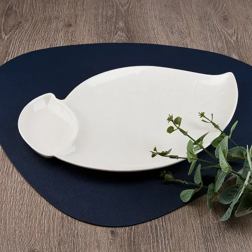 Блюдо выполнено из фарфора — материала, отличающегося прочностью и гигиеничностью. Поверхность имеет белое покрытие. Форма изделия фигурная, что является элементом дизайна коллекции.