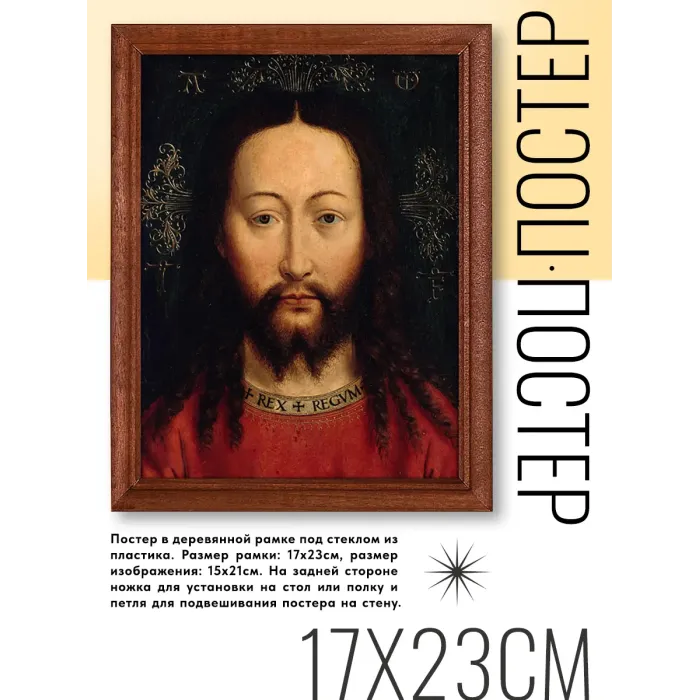 Постер в рамке с репродукцией картины Яна Вана Эйка 'Лик Христа' — это стильное решение для декорирования различных пространств. Он прекрасно подходит для оформления салонов, магазинов, офисов и жилых помещений. Основные особенности включают: