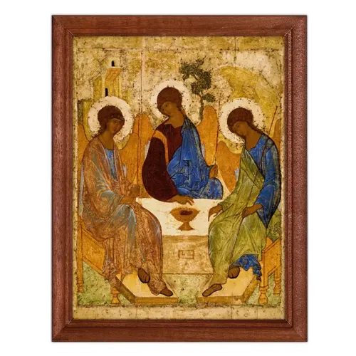 Постер в рамке с репродукцией знаменитой картины "Троица" Андрея Рублёва — это не только элемент декора, но и символ духовности и традиций русского искусства. Изображение выполнено на качественной бумаге и заключено в стильную деревянную рамку под пластиковым стеклом, что обеспечивает долговечность и защиту от повреждений.