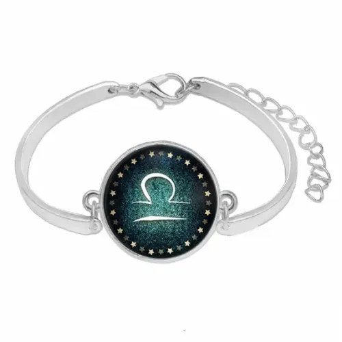 Металлический браслет с изображением знака зодиака Весы под выпуклой стеклянной линзой.