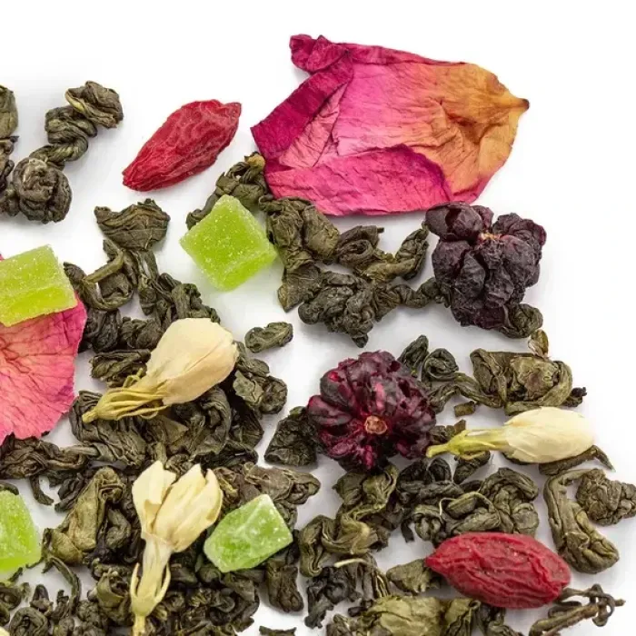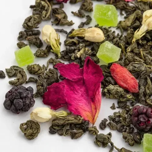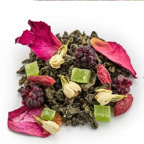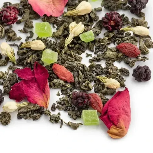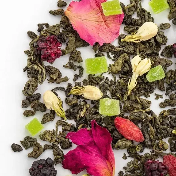Этот ароматизированный зелёный чай создаёт атмосферу тропического сада. В основе — классический ганпаудер, обогащённый ярким ансамблем из ягод ежевики и годжи, кусочков ананаса, лепестков розы и цветов жасмина, что рождает свежий, насыщенный фруктово-цветочный букет.