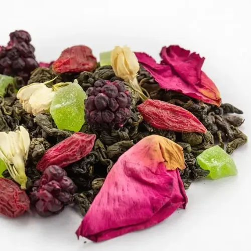 Состав: зелёный чай ганпаудер, ягоды ежевики, кусочки ананаса, ягоды годжи, лепестки розы, листья ежевики, цветы жасмина.