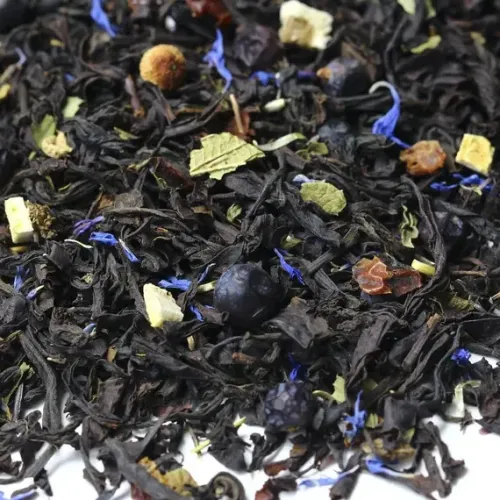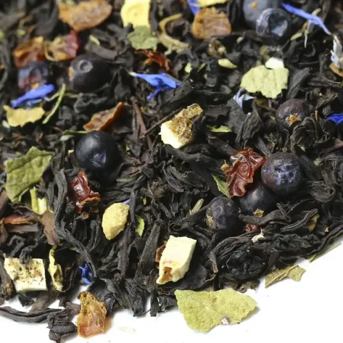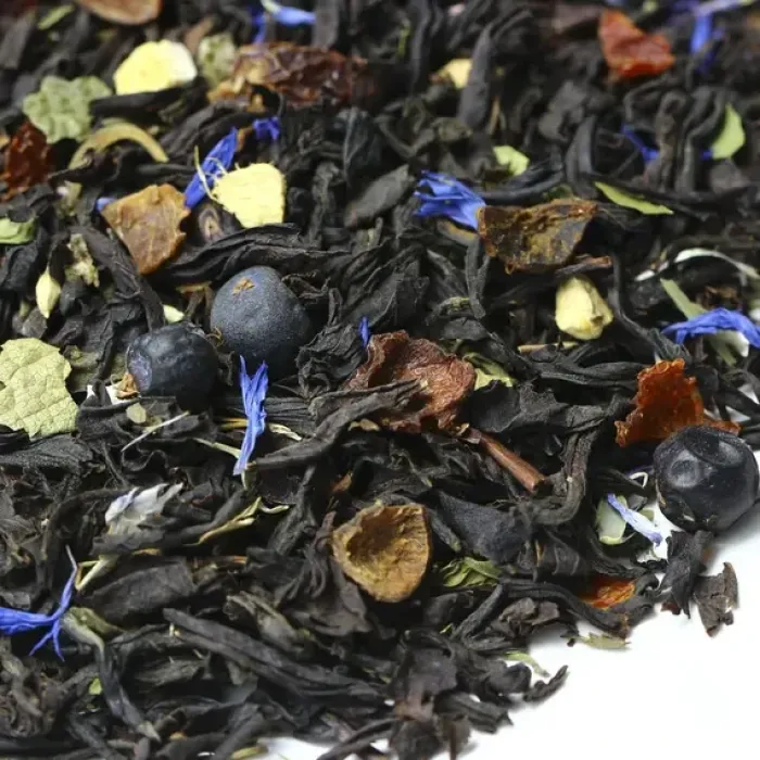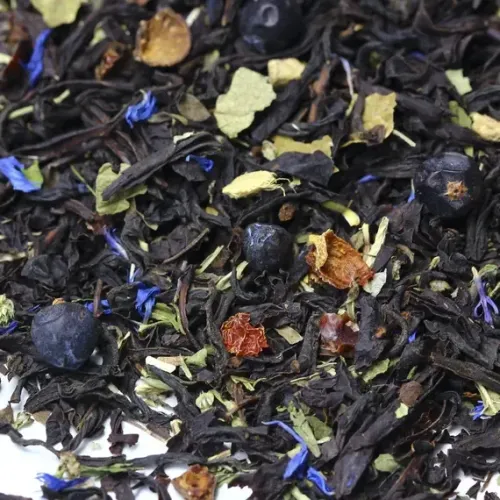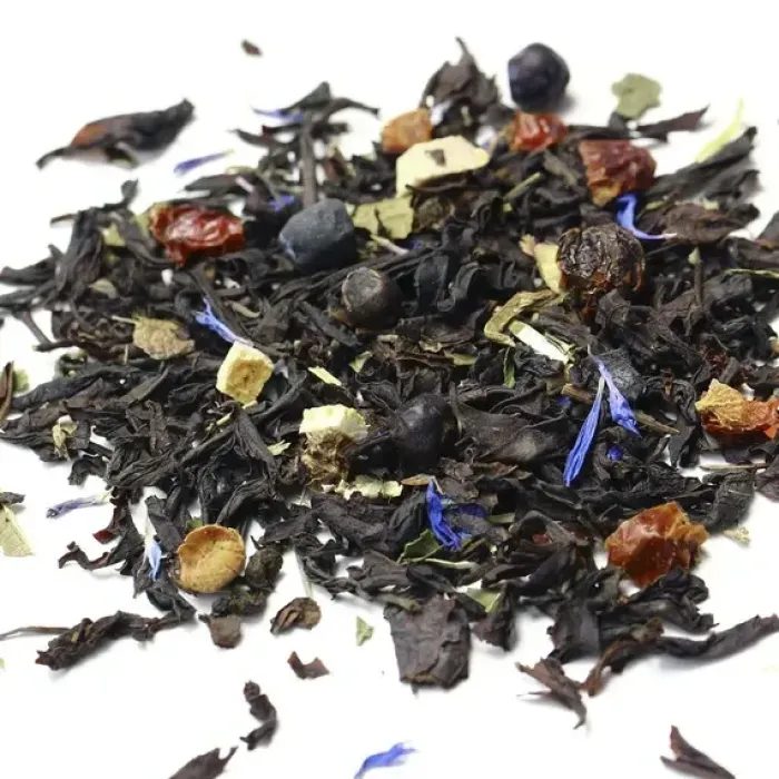 Состав: чёрный цейлонский чай, измельчённые плоды шиповника, плоды можжевельника, листья мяты, кусочки имбиря, чабрец, цедра лимона, листья смородины, лепестки синего василька.