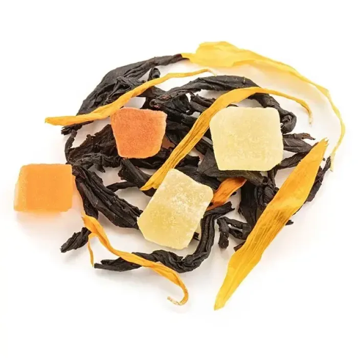Состав: чёрный индийский чай, кусочки ананаса, кусочки папайи, лепестки календулы, ароматизатор «тропические фрукты» (включая ноты саусепа и манго).