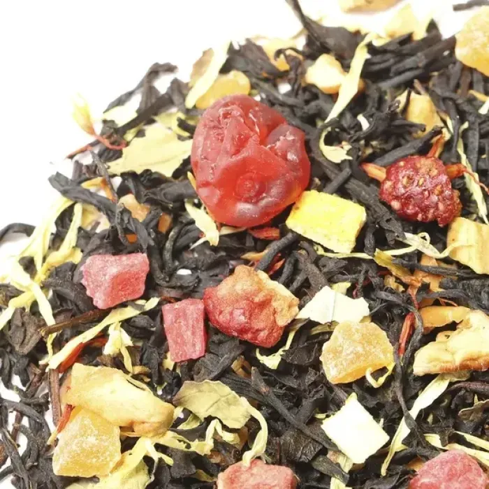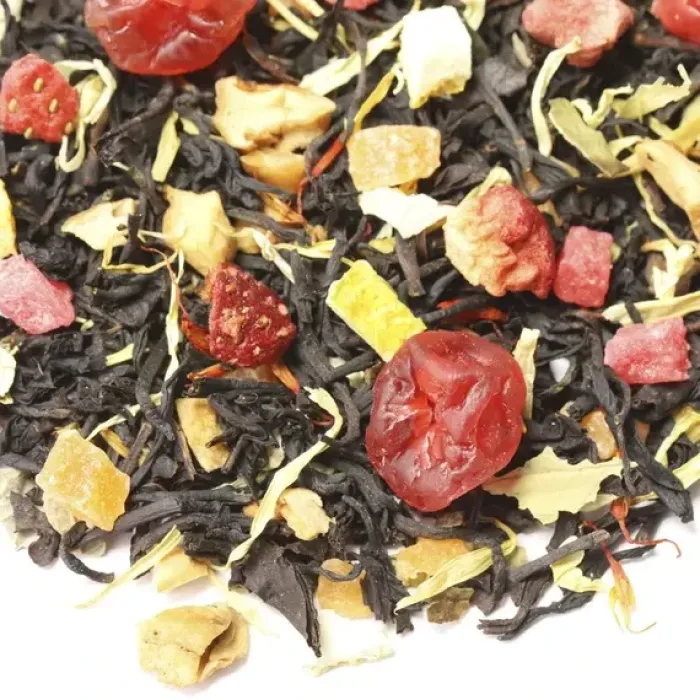 Состав: Чай чёрный индийский, кусочки ананаса, кусочки яблок, цедра апельсина, ягоды вишни, кусочки клубники, листья ежевики, лепестки календулы, лепестки сафлора, аромат экзотических фруктов.