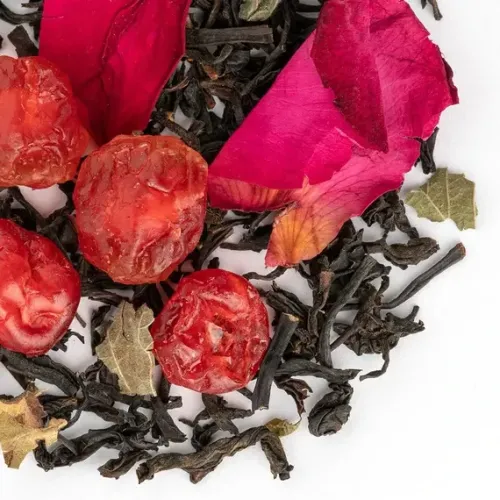 Ароматизированный чёрный чай, создающий яркий и согревающий букет. Классическая индийская основа сочетается со сладкими ягодами вишни, лёгкой клюквенной кислинкой и тёплыми нотами рома, которые дополняются свежестью листьев смородины и изысканностью лепестков розы.