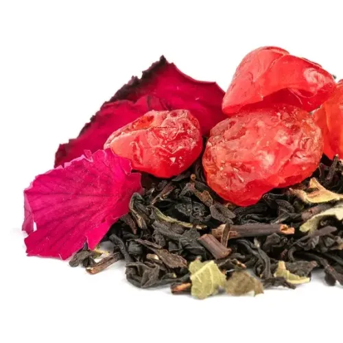 Состав: Чёрный индийский чай, ягоды вишни, кусочки клюквы, лепестки розы, листья смородины, ароматизатор «вишня с ромом».