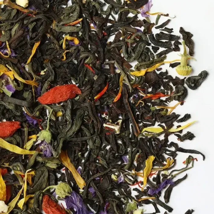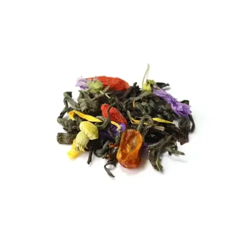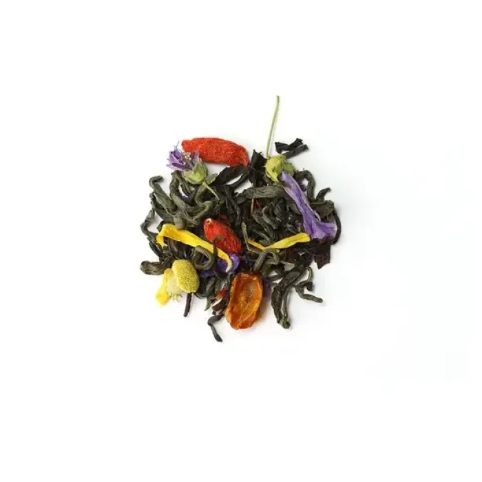 Состав: Чай чёрный цейлонский среднелистовой высокогорный, чай зелёный китайский среднелистовой, ягоды годжи, ягоды облепихи, цедра лимона, цветы мальвы, цветы ромашки, лепестки календулы, лепестки сафлора, аромат лимона