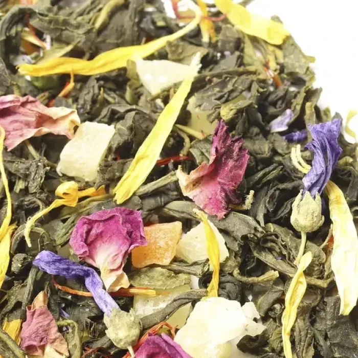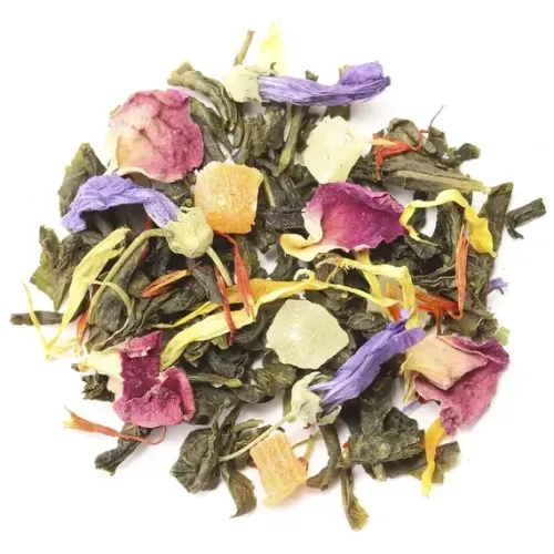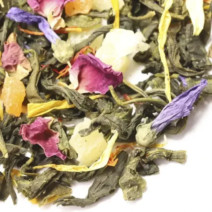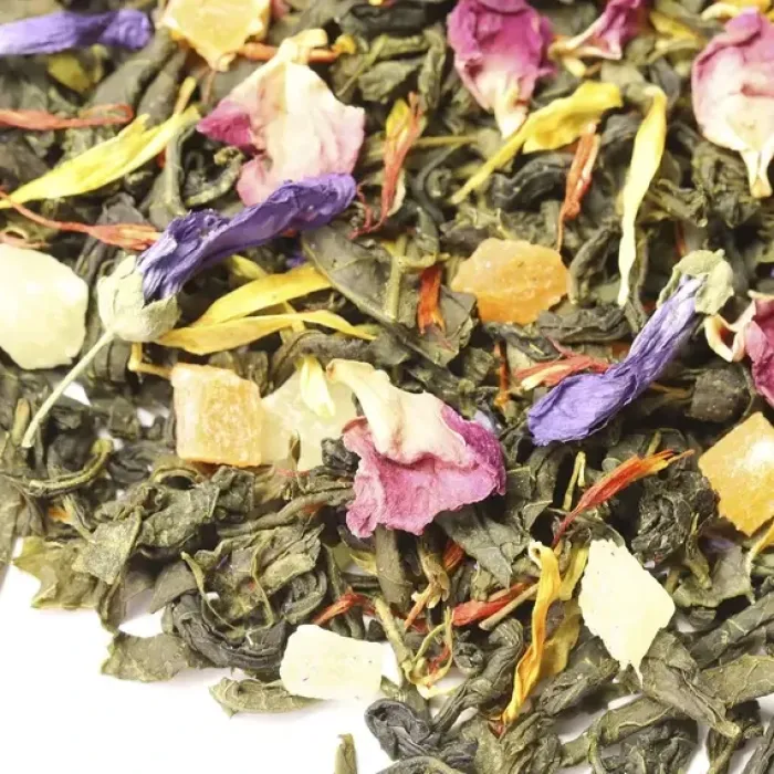 Этот ароматизированный чай создаёт атмосферу яркого восточного благоухания. Крупнолистовая китайская основа с кусочками ананаса и цветочным ансамблем даёт свежий фруктовый вкус с нотами персика и манго, а настой окрашивается в тёплые светло-янтарные тона.