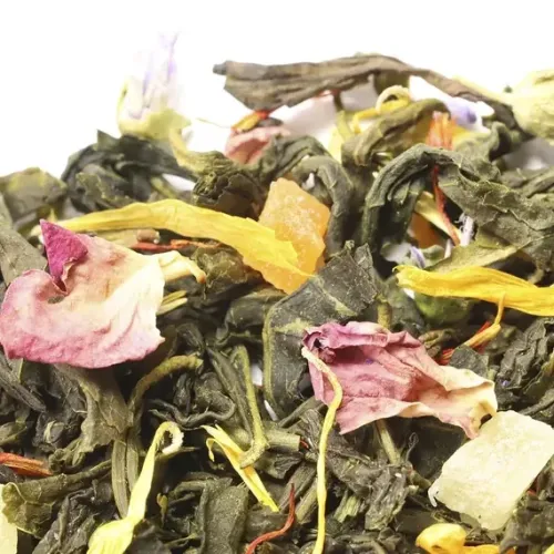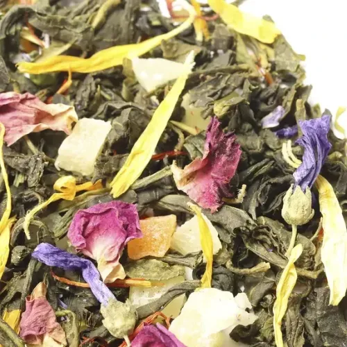 Состав: Зелёный китайский крупнолистовой чай, кусочки ананаса, цветы мальвы, лепестки сафлора, лепестки красной розы, лепестки календулы, ароматизаторы (персик, манго)