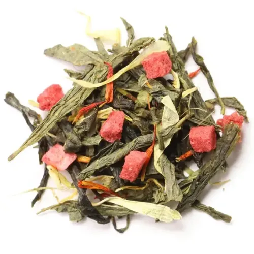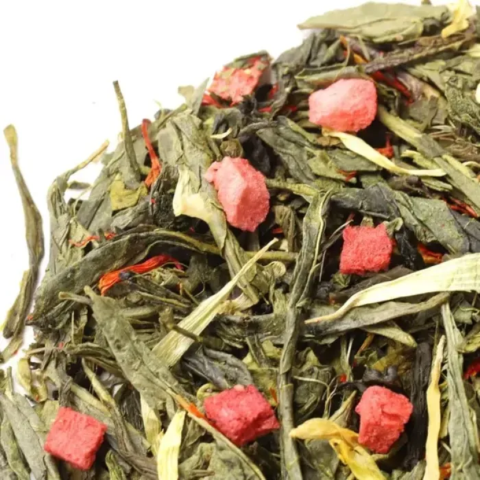 Состав: зелёный китайский чай Сенча, зелёный китайский чай Ганпаудер, кусочки клубники, лепестки сафлора, лепестки календулы, ароматизатор «Клубника со сливками»