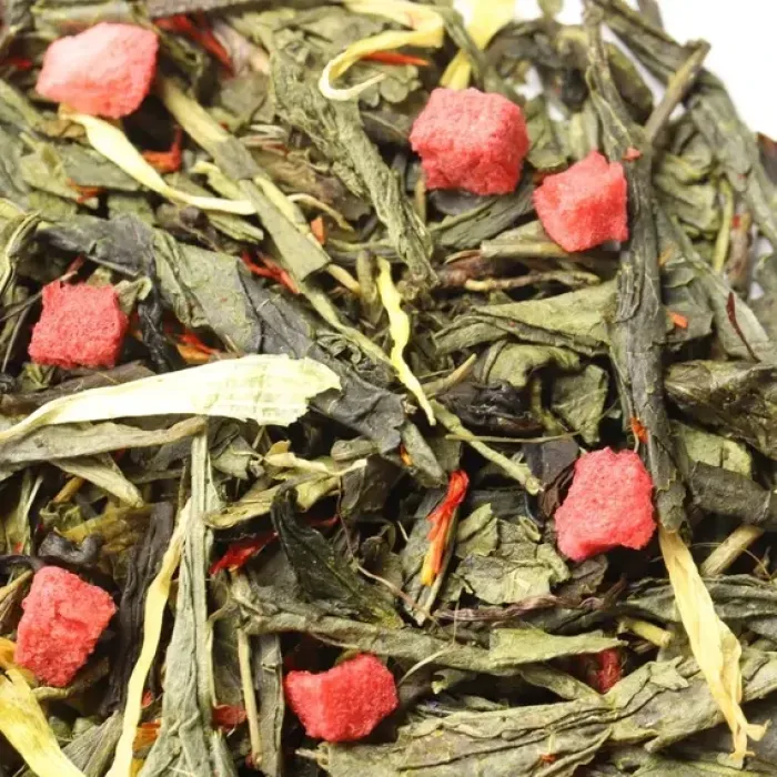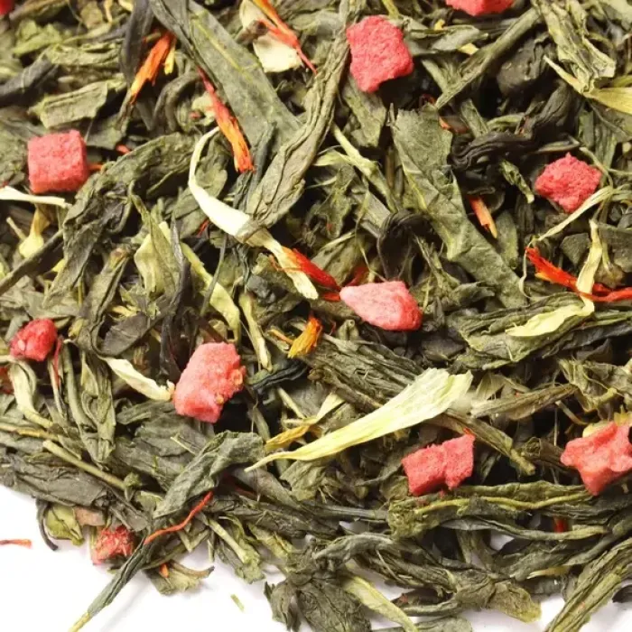 Ароматизированный зелёный чай с ярким, бархатистым ароматом свежей клубники и нежных сливок. В основе — китайские чаи, украшенные кусочками ягод и цветочными лепестками, которые дают мягкий вкус с терпкими нотками и зелено-янтарный настой.
