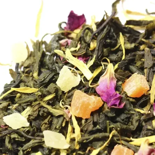 Этот ароматизированный чай построен на классической основе китайского зелёного чая Сенча, который создаёт мягкую, слегка терпкую основу. Его дополняет яркий, звонкий аромат манго, сладость тропических фруктов (включая ананас) и цветочные акценты лепестков розы и календулы, что в итоге рождает гармоничный и увлекательный ансамбль.