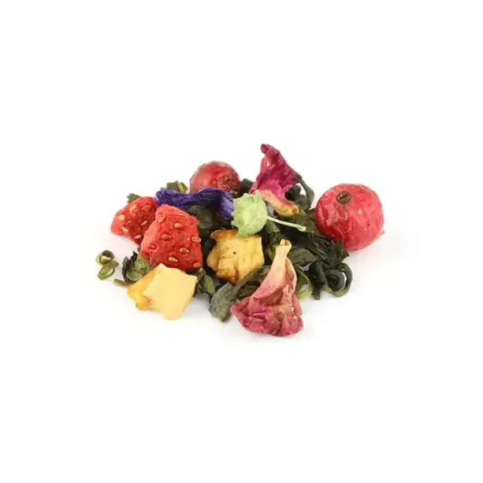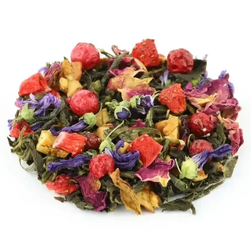 Состав: Зелёный китайский чай, кусочки яблок, цветы мальвы, лепестки розы, ягоды красной смородины, кусочки клубники, ароматизатор «лесные ягоды».