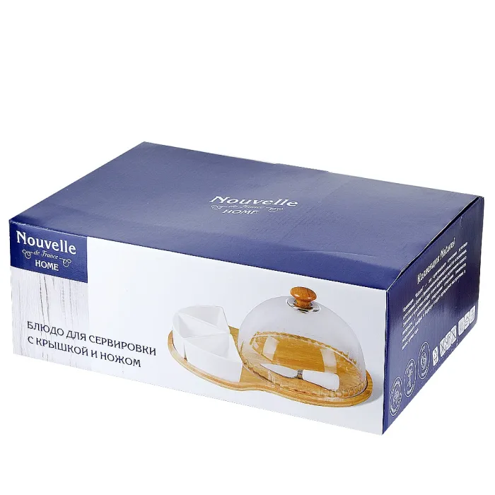 Основной материал — фарфор, обладающий гигиеничностью и термостойкостью, что позволяет использовать блюдо в микроволновой печи. Бамбуковая подставка служит устойчивым основанием и элементом декора. В комплект входит нож длиной 12 см для нарезания продуктов.