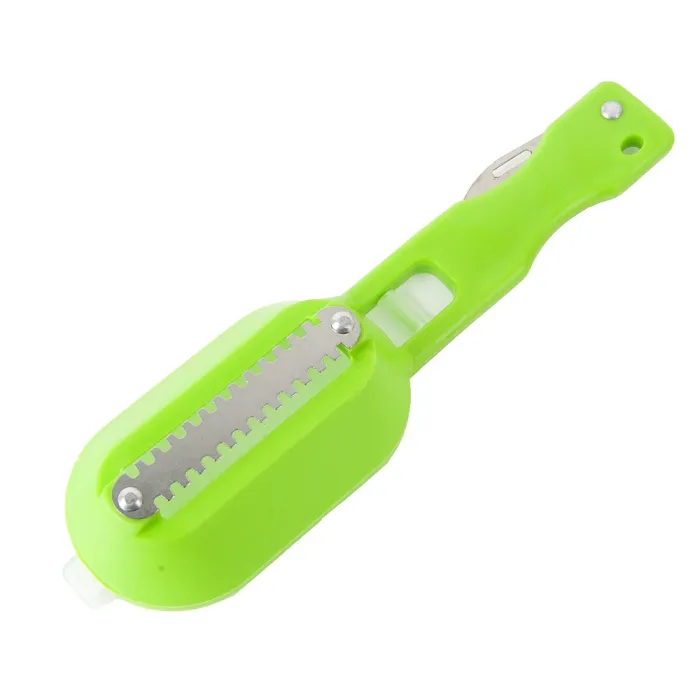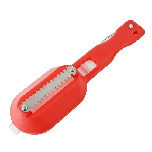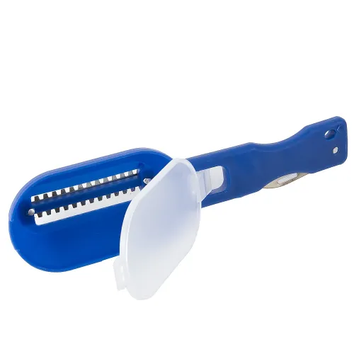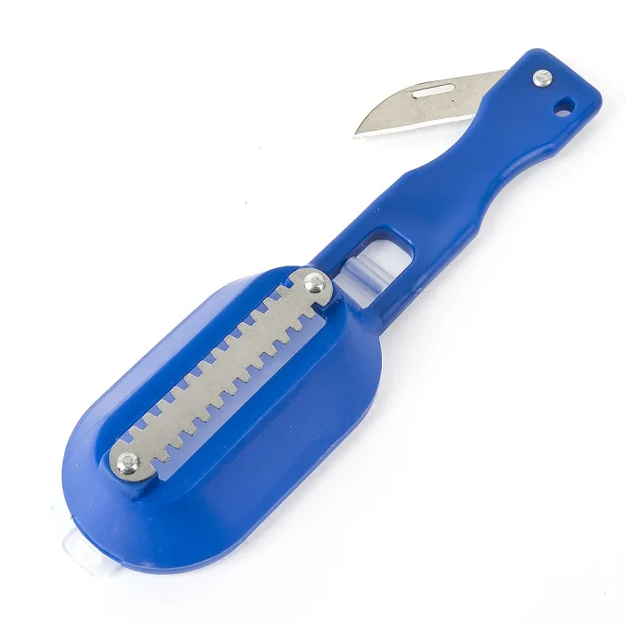 Рабочая часть изготовлена из нержавеющей стали, устойчивой к коррозии. Полипропиленовая ручка обеспечивает комфортный захват без скольжения. Конструкция с тремя видами лезвий позволяет справляться с различными типами чешуи.