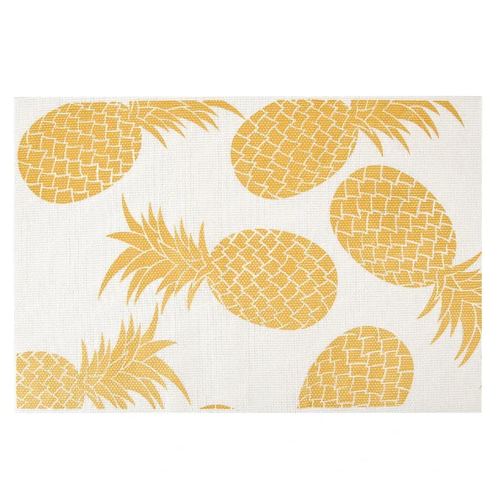 Материал ПВХ обладает устойчивостью к влаге и прост в очистке. Поверхность салфетки с нанесённым изображением ананаса имеет фактуру, предотвращающую скольжение посуды. Конструкция плейсмата не включает дополнительных элементов, его форма прямоугольная с прямыми краями.