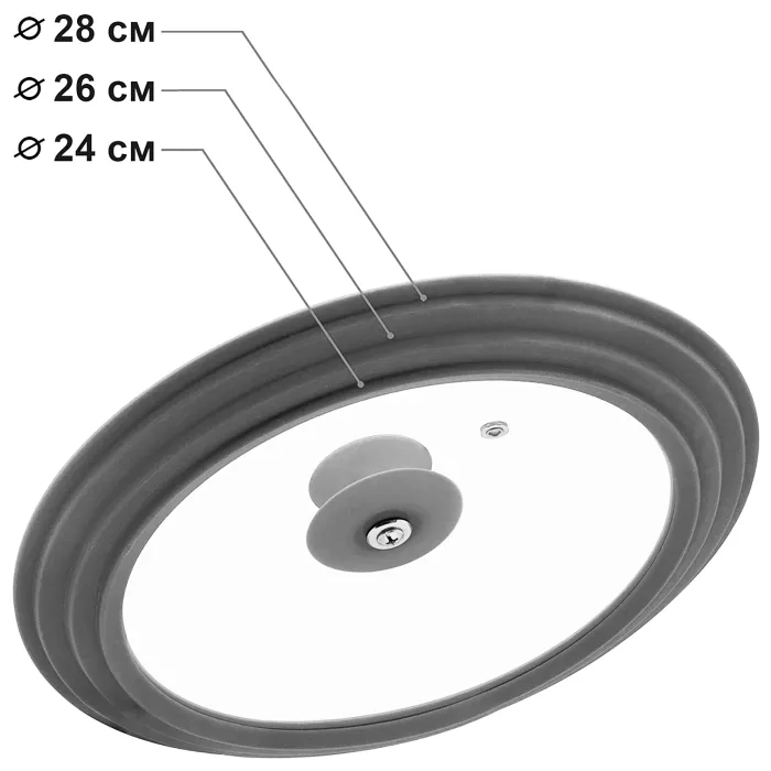 Крышка изготовлена из боросиликатного стекла, которое отличается высокой термостойкостью и прочностью. Силиконовый обод по краю обеспечивает плотное прилегание к посуде разных диаметров. Конструкция включает отверстие для выхода пара, что предотвращает выкипание жидкости. Кнопка на ручке упрощает снятие крышки.